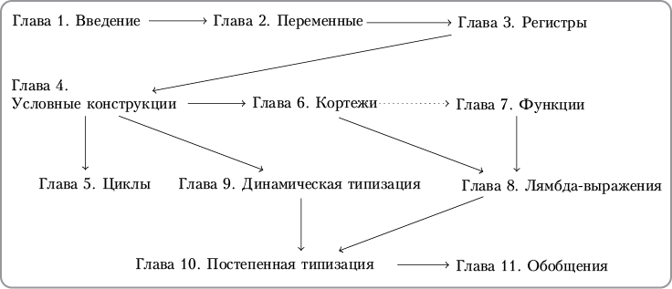 С 2009 года черновики этой книги используются в 16-недельном курсе построения компиляторов для студентов старших курсов в Университете Колорадо и Университете штата Индиана. Слушатели этого курса уже владеют основами программирования, структур данных, алгоритмов и дискретной математики. В начале обучения студенты разбиваются на группы от 2 до 4 человек. Группы изучают главы, соответствующие их интересам, начиная с главы 2, по одной примерно за две недели, соблюдая при этом зависимости между главами, показанные на илл. 0.1. Глава 7 (функции) зависит от главы 6 (кортежи) только в реализации эффективных хвостовых вызовов. Последние две недели курса отводятся под курсовой проект, в котором студенты проектируют и реализуют расширение компилятора по своему выбору. Для поддержки таких проектов могут использоваться заключительные главы книги. Во многие главы включены задания повышенной сложности.