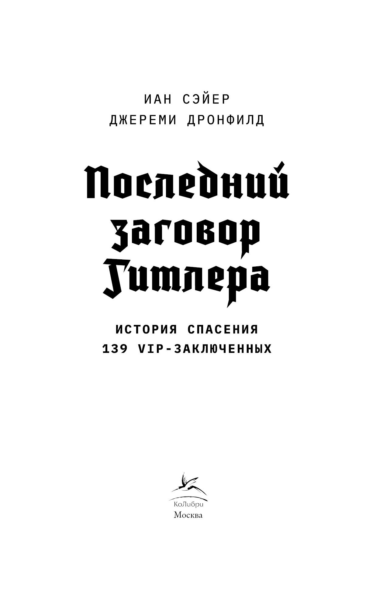 Последний заговор Гитлера : История спасения 139 VIP-заключенных / Джереми Дронфилд, Иан Сэйер ; [пер. с англ. М. В. Кедровой]. — М. : КоЛибри, Издательство АЗБУКА, 2025.