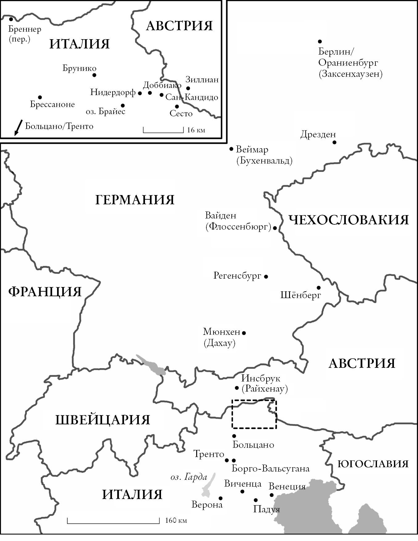 Основная карта: карта Европы и немецких лагерей (в скобках) периода Второй мировой войны с довоенным указанием границ. Врезка: Южный Тироль