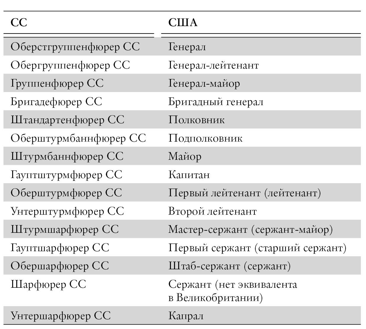 Эквиваленты званий СС в армиях США и Великобритании являются приблизительными и могут отличаться в зависимости от источника, в первую очередь это касается унтер-офицерских званий. В этой книге используются следующие эквиваленты. (Звания Великобритании, где они отличаются от званий США, указаны в скобках.)