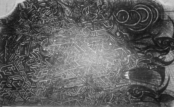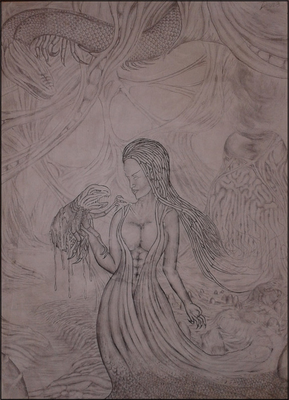 Матку окружала гигантская органическая структура в виде сплетения слизких волокон, трубок и щупалец различной формы, плёночные соединения и прочая органика, покрывающая всё вокруг и связывающая Чёрную Мать с пульсирующими стенами, потолком и полом этой зловонной обители. Было видно, что она почувствовала моё появление и отсоединилась от своей системы деторождения, однако её трубчатые подобия волос, имеющих огромную длину, были по-прежнему связаны с основанием переливающейся всеми цветами установки Сбора Энергии. Установка имела форму шара на усечённом конусе, размеры которого были поистине колоссальны. Казалось невероятным — как такой большой объект может поместиться в непомерно малом помещении. Было очевидно, что пространство здесь сильно искажено, сжато.