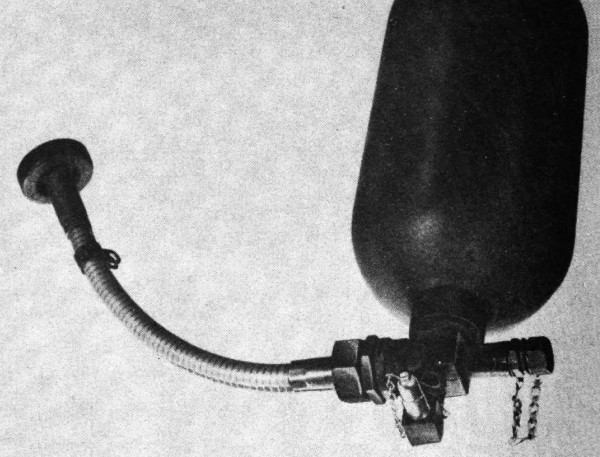 (2) Tie one pressure tank and valve assembly to top of one flat 5-gallon fuel can so that flexible shaft and handle hang down parallel to one side of the fuel can.