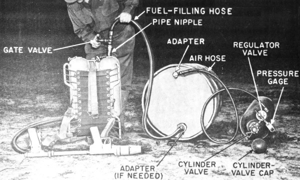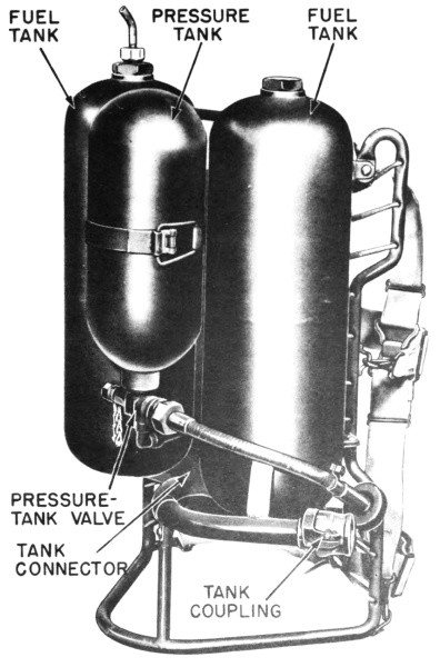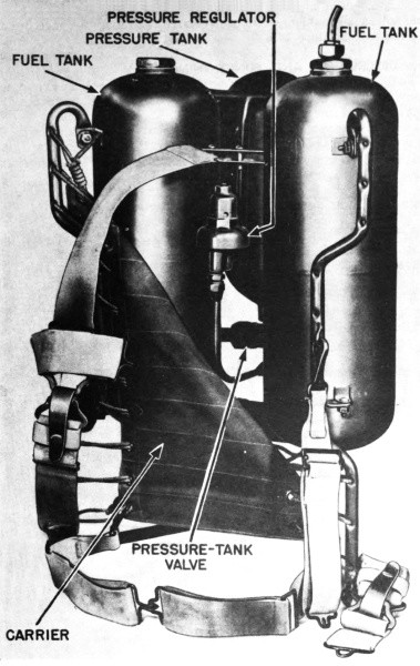 Detachable pressure tank and valve assemblies (par. 66.1) make possible the use of packboards for transporting pressure tanks, 5-gallon cans of fuel, wrenches, and additional ignition cylinders close to the front line of combat to troops using flame throwers. As packboards are not manufactured specifically for servicing flame throwers, standard quartermaster-issue packboards are used. Packboard transportation is practicable only with pourable fuel. (Pourable fuels include some thickened fuels and all liquid fuels.)