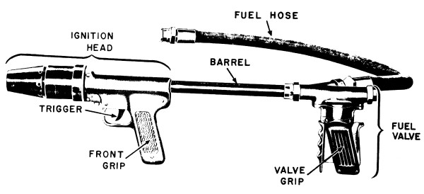 c. If no additional shots are to be fired before refilling and recharging, open pressure-tank valve by turning handle counterclockwise. Point the gun away from personnel and blow out the remaining fuel and pressure, if any, from the fuel tanks by squeezing the valve lever and grip safety until there is no further discharge. The trigger should not be used during this operation. Then close the pressure-tank valve to prevent entrance of foreign matter into the pressure system.