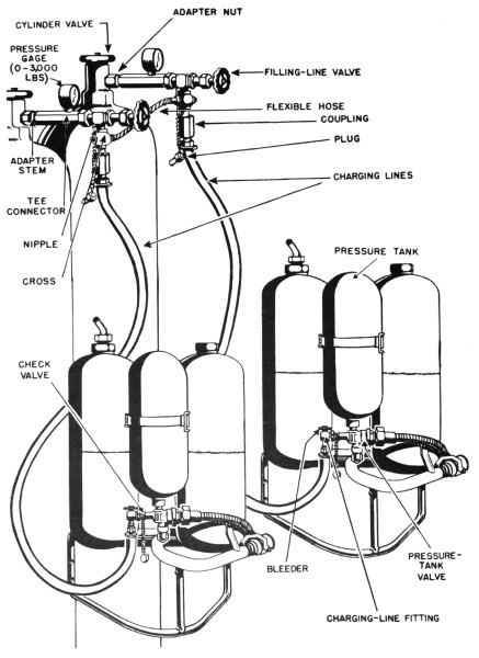 Figure 23. Charging two pressure tanks, using charging and filling lines, and cylinders of compressed air or nitrogen. As many as four pressure tank and valve assemblies, on or off tank groups, can be charged at one time from cylinders coupled as shown in figure 24.