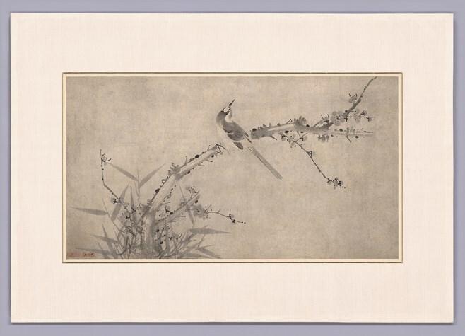 Рис. 2. Чо Сок (조속, 1595–1668). Птица на ветке сливы. XVII в. Бумага, тушь, 83,3 × 46,1 см. Национальный музей Республики Корея, Сеул