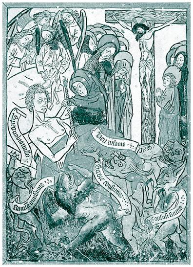 В это же время появились тексты под названием «Искусство умирать», проиллюстрированные очень выразительными гравюрами7. На них изображались, в частности, сцены с архангелом Михаилом, взвешивающим души (психостасия), демоны у постели умирающих и черти, уносящие души грешников. Напоминания о смерти были повсюду — на фресках, в проповедях, в литературе. Так, в притче «О трех живых и трех мертвых» звучит страшная фраза, которую мертвые говорят живым: «Вы те, кем мы были, мы те, кем вы будете» (Quod fuimus estis, quod sumus vos eritis).