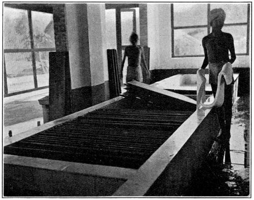 This feature in factory working is all the more annoying because the necessity for it could so easily be obviated. All that is necessary is the erection of a wide, open verandah outside the wall of the factory. Here all latex could be received and strained, scrap-rubbers could be received and passed through an opening into tanks placed in convenient position. Water could be laid on in this verandah so that coolies might wash their buckets, and the whole verandah might be enclosed only with expanded metal so as to avoid interference with the lighting of the factory. In this way it would be quite unnecessary for any field coolie to enter the factory proper, and this would facilitate cleanliness. Such an arrangement has been discussed by the writers many times during the last few years, but the number of estates which have made such provision is still in the minority, and the same slipshod and dirt-making procession of coolies continues to walk through the factories, and the same piles of bark-shavings and scrap-rubber continue to accumulate and ferment in a few instances.