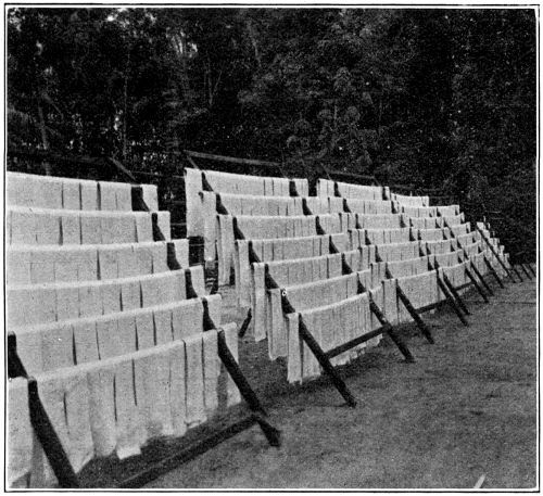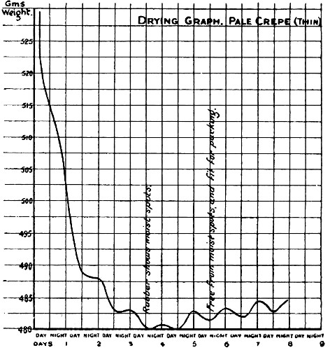 It is often asked whether a temperature of 100° F., such as is obtained in the upper room, is calculated to injure the quality of the rubber. There need be no fear on this ground; the experience of many estates goes to show not only that no harm results, but also that the drying of the rubber is expedited. There would seem to be no reason why crepe rubber should not be dried at a temperature of 100° F. It must be understood, however, that higher temperatures for crepe rubber are not recommended, as it has been proved that the rubber is affected. The fact becomes obvious with continued treatment at temperatures much above 100° F., for the rubber stretches and breaks across the support.