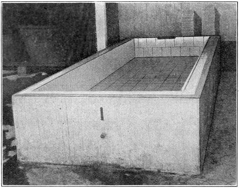 Situation of Tanks.—It will be noted that these verandahs are raised from the ground-level to a height of about 3 feet in order that latex may be gravitated, with a slight fall, into the coagulating tanks which are within the factory. There exists a real necessity for this practice, inasmuch as otherwise to obtain gravitation of latex (which is quicker and cheaper than handling) the coagulating tanks would have to be either placed on the floor or sunk beneath the level. The risk of contamination of latex or coagulum under such circumstances would be appreciable. Apart from this, it is advisable to have the coagulating tanks raised to a height of between 2 and 3 feet, to secure the advantage of ease of working in the processes of coagulation and the handling of coagulum—a not inconsiderable factor.