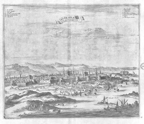 Астрахань в 1630-х годах. Из книги путешествия по Московии Адама Олеария. Издание начала XVIII в.