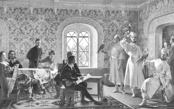 А. Д. Литовченко. Итальянский посланник Кальвуччи рисует любимых соколов Алексея Михайловича (фрагмент). 1889