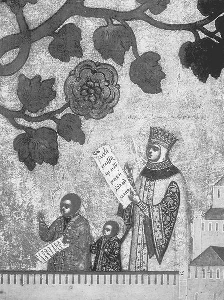 Мария Милославская с сыновьями Алексеем и Феодором. Деталь иконы Симона Ушакова «Похвала Богоматери Владимирской (Древо Московского государства)». 1668