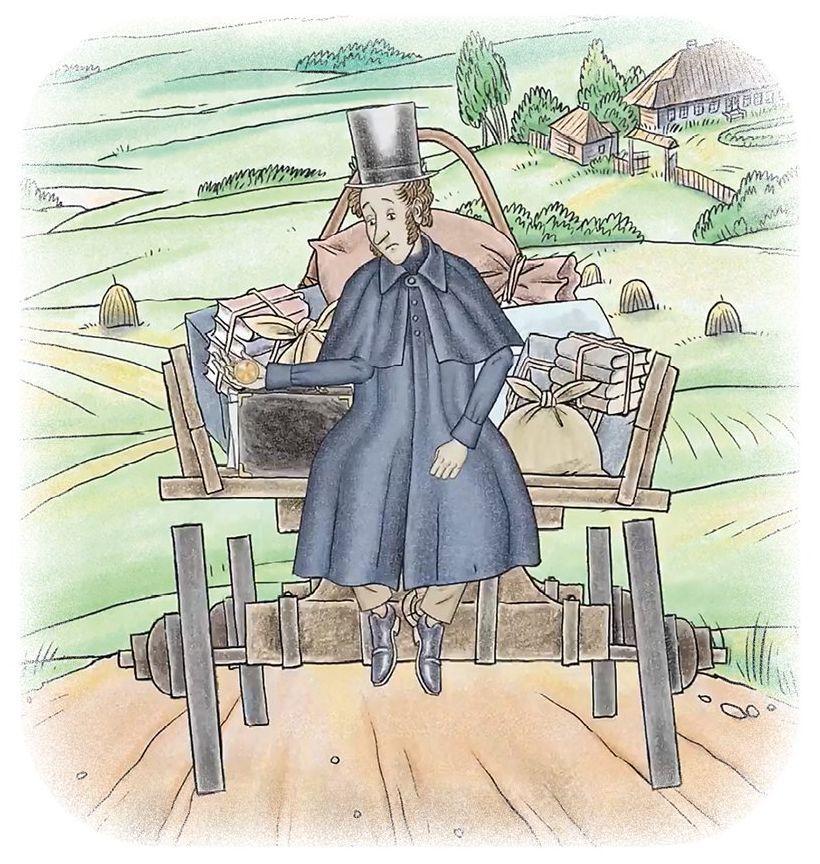 Его седые лохматые брови поднялись домиком, как бы выражая мысль о важности барина, но, когда телега подпрыгнула на очередной кочке, кучер всё же решил, что виновата дорога. Старик хотел было продолжить беседу, однако, посмотрев на Александра ещё раз, окончательно передумал и лишь изредка незаметно поглядывал на своего спутника, изучая его необычную внешность, длинный нос и высокий как столб чёрный цилиндр.
