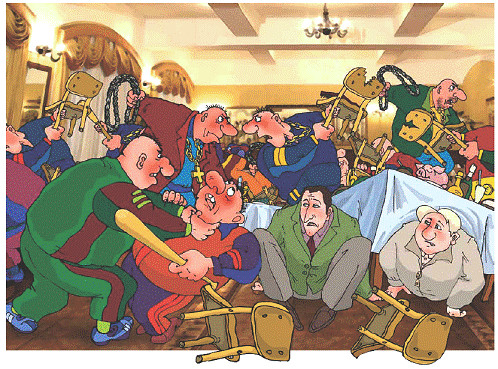 Дальнейшие события развивались со скоростью горения пороха. Вошедшие подошли к столику «спортсменов» и стали грубо разговаривать. Тем это не понравилось, и они начали кидаться стульями. Когда стулья закончились, схватились врукопашную. Потом послышались выстрелы.