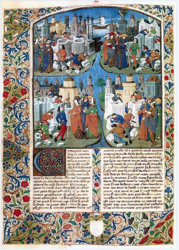 На иллюстрациях из средневековых манускриптов показано строительство четырех великих городов. Рим, Карфаген и Венецию основывают и отстраивают троянцы, беженцы, спасшиеся из поверженной Трои. Одновременно троянцами был основан город Сикамбрий, ныне неизвестный, но видимо хорошо известный в Средние века. В современной истории Троянская война происходила в XII веке до Нашей Эры, а Рим был основан в Италии братьями Ремом и Ромулом в VIII веке до НЭ. Карфаген был основан в Африке в IX веке до НЭ хитроумной Элиссой — Дидоной, окружившей бечевками из бычьей кожи пространство для будущего города. Хотя, когда троянский герой Эней, скитавшийся по морям после бегства из Трои, видимо, еще в XII веке до Нашей Эры, попал в гости к этой карфагенской царице, ее город вроде бы уже существовал.