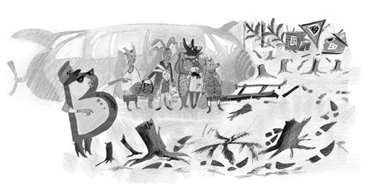 Но вдруг поезд со скрежетом затормозил и остановился. Пассажиры высыпали из вагонов. Подумать только! Дальше пути не было! Это Кляксич (кто же ещё!) унёс рельсы, разобрал шпалы и даже спилил все деревья!
