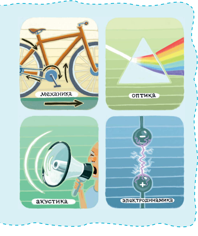 — Ты прав — природа действительно слишком разнообразна для одной, даже очень большой науки, поэтому физика разделилась на много частей. Каждая из них изучает свои физические явления. Механика изучает движение, оптика — свет, звуком занимается акустика, а электричеством и всем, что с ним связано, — электродинамика. Есть и другие разделы физики.