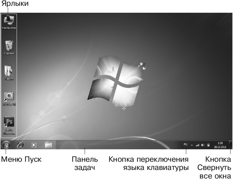 Как автомобилю зимой необходимо разогреться перед поездкой, компьютеру нужно некоторое время на то, чтобы подготовиться к работе. Время включения ПК обычно называют загрузкой. Дождитесь, пока на экране перестанут идти загрузочные «мультики» и появится неподвижное изображение, так называемый Рабочий стол (рис. 2.2).