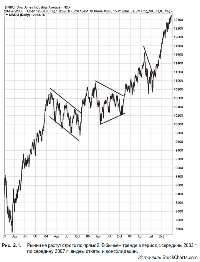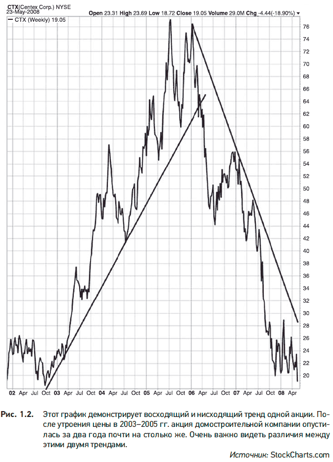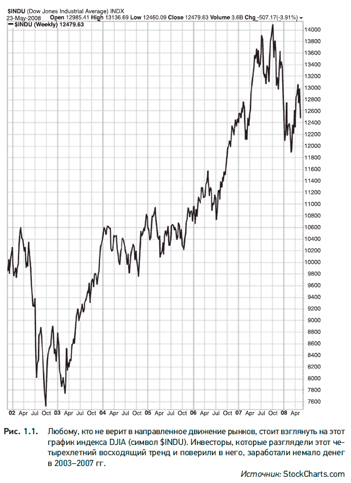 Вторая причина, по которой график работает, заключается в направленном движении рынков. Не верите? Тогда взгляните на график индекса Dow Jones Industrial Average (рис. 1.1). Если он не убеждает, то купите себе падающую акцию. Тогда вы сразу почувствуете нисходящий тренд. В исследовании тренда и состоит суть визуального анализа. Поэтому далее использование всех инструментов и индикаторов будет нацелено на одно: выявление тренда акции или рынка — восходящего или нисходящего. На рис. 1.2 показано, почему так важно понимать, куда все идет — вверх или вниз.