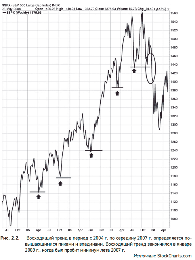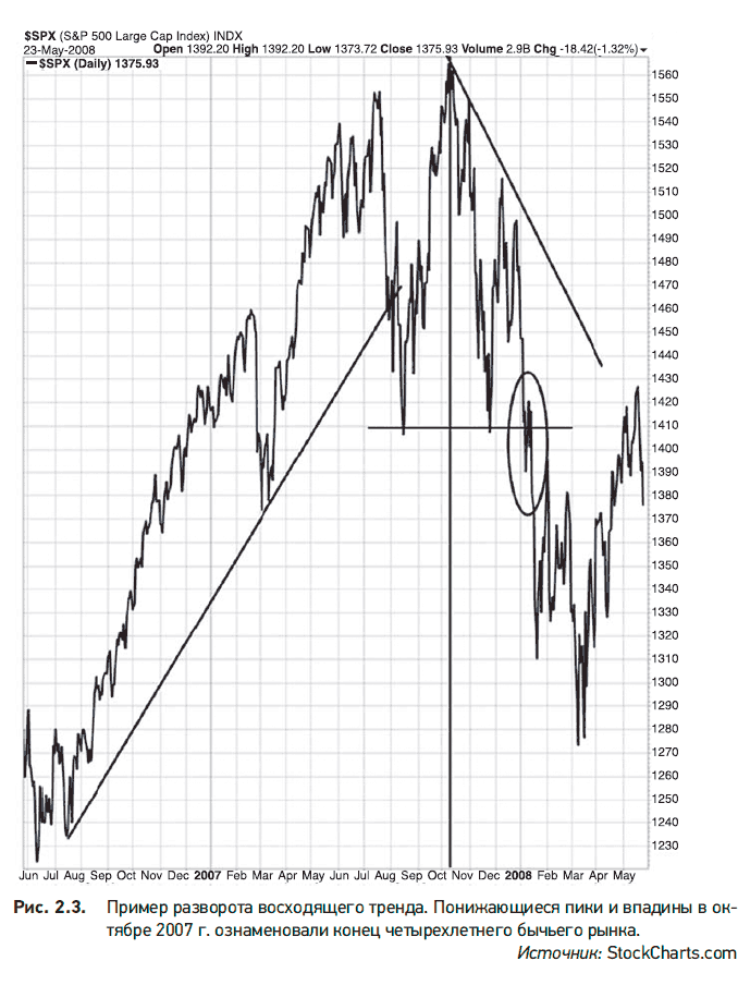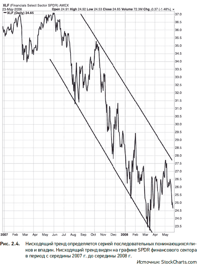 Поскольку первоочередной задачей визуального анализа является изучение тренда, необходимо пояснить, что это такое. Тренд — это, попросту говоря, направление движения рынка. Следует понимать, что ни один рынок не движется строго по прямой. Если взглянуть на график бычьего рынка акций, который начался в 2003 г., легко заметить периоды коррекций вниз и горизонтальную консолидацию (см. рис. 2.1). Восходящий тренд чаще всего представлен серией повышающихся пиков (максимумов) и впадин (минимумов). Пока каждый последующий пик или впадина выше предыдущих, восходящий тренд остается неизменным (см. рис. 2.2). Любая неудачная попытка превзойти предыдущий максимум является ранним сигналом возможности разворота тренда. Любое падение ниже предыдущего минимума обычно служит подтверждением свершившегося разворота (см. рис. 2.3). Нисходящий тренд — это просто зеркальное отражение восходящего; он характеризуется серией понижающихся пиков и впадин (см. рис. 2.4). О развороте предшествующего нисходящего тренда можно говорить, если рынок сумел удержаться выше предыдущего минимума и прорвал затем предыдущий максимум.