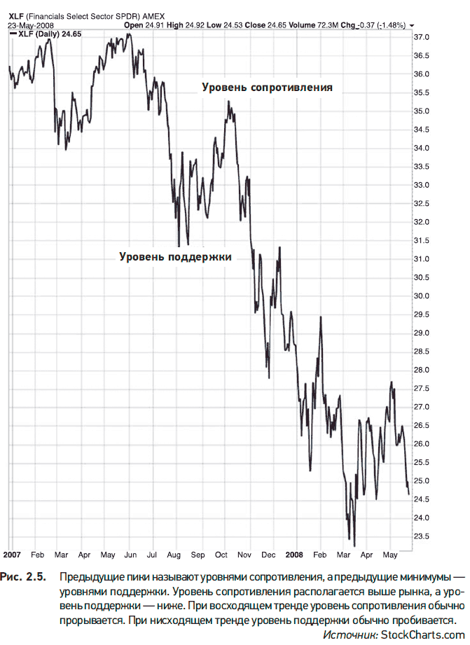 К счастью, эти пики и впадины имеют красноречивые названия (см. рис. 2.5). Уровнем поддержки называют минимум, или впадину, которая сформировалась в прошлом. Аналитики нередко говорят, что цены отскакивают от уровня поддержки. При этом они обычно имеют в виду предыдущий минимум, достигнутый на прошлой неделе, в прошлом месяце или году. Помните, что уровень поддержки всегда располагается ниже рынка. Как ведет себя рынок вблизи уровня поддержки, имеет очень большое значение. Если он закрывается ниже уровня поддержки (пробивает уровень поддержки), то возобновляется нисходящий тренд. Отскок цен от уровня поддержки (успешное тестирование уровня поддержки) обычно является первым признаком достижения дна и завершения нисходящего тренда.