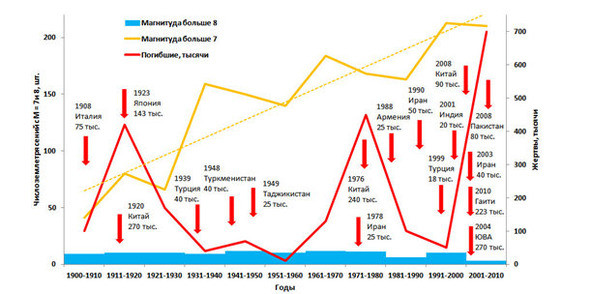 Общее число жертв и сейсмическая активность по десятилетним интервалам времени. Стрелками отмечены землетрясения с наибольшим количеством жертв. Гистограммой внизу показано число мегалоземлетрясений определяющих основную сейсмическую энергетику планеты. Пунктирная линия с линейным трендом это число зарегистрированных землетрясений с магнитудой около шести по шкале Рихтера. Положительный тренд характеризует увеличение разрешающей способности мировой системы сейсмических наблюдений, а не увеличение сейсмической активности Земли. Первый этап 1900—1930 гг. — становление телесейсмических наблюдений. Второй этап 1930—1980 гг. — создание региональных систем и сетей для слежения за ядерными испытаниями. Третий этап 1980—2010 гг. — появление цифровых сейсмических станций и использование ЭВМ для обработки данных. Квазипериодические флуктуации с повторением в среднем 20 лет с вокруг тренда, видимо, связаны с природными факторами (Каррыев,2016).