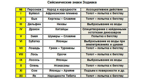 Представителей животного мира «взывающих землетрясения» насчитывается намного больше чем знаков Зодиака. В Африке с землетрясениями отождествлялся буйвол, в Греции — лошадь, в Сибири — лось, а в Японии — сом. Правда, китайцам с их вызывающими подземные катаклизмы драконами не повезло. Найти им природный аналог достаточно сложно, разве что в образе динозавров, хотя они и вымерли задолго до появления этого этноса. Тем не менее, если следовать гипотезе о происхождении птиц от крылатых динозавров, то и здесь от мифа можно перейти к конкретному персонажу.