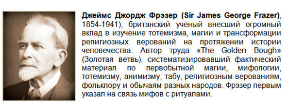 Большой вклад в изучение роли мифов в жизни древних людей принадлежит британскому учёному Джеймсу Фрэзеру. Он собрал и систематизировал огромный материал по первобытной магии и мифологии. Указал на их важную роль в формировании современной культуры и доказал её органическую связь с религиозными ритуалами и суевериями.