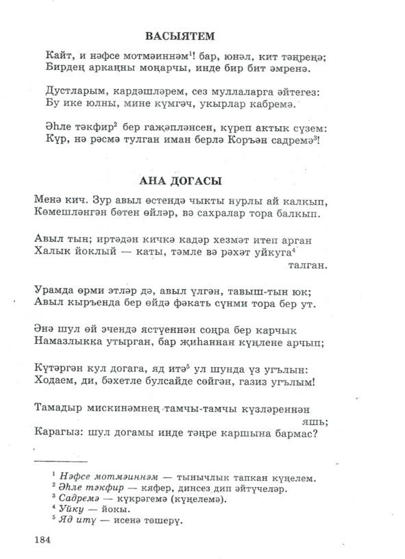 Школы повышенного типа должны быть смешанными, в частности, объединены техникумы. Это явится лучшим методом скорейшей ассимиляции кряшен с татарами. Надо практиковать назначение в татарской школе учителей из кряшен и обратно; печать должна быть единой. Яналиф среди кряшен деревни прививается хорошо. Сейчас перед кряшенской интеллигенцией стоит громаднейшая задача в деле изучения татарской литературы, без чего кряшенские культурные силы не сумеют целесообразно приложить свои знания по работе в общетатарской массе».