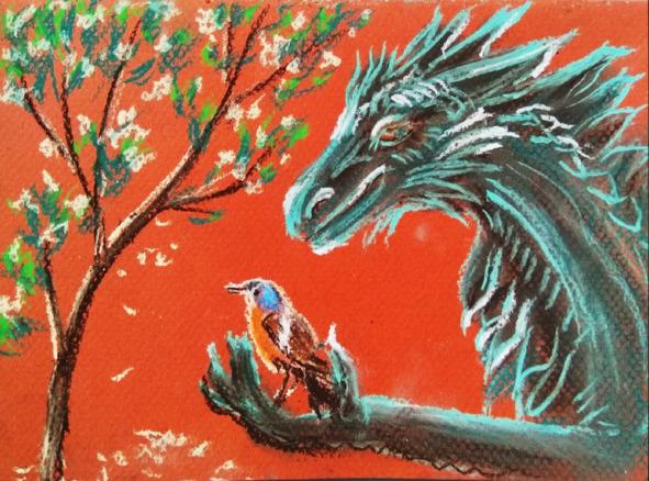 Поэтому Драконесса не удивилась, увидев лежащую на земле птичку. «Бедная, не выдержала голода и холода», — подумала Драконесса, наклоняясь, чтобы разглядеть красивое оперение пташки.