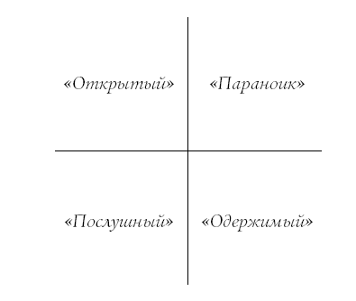 Пересечения осей дают нам четыре клеточки. Разумеется, такое деление условно, поскольку состояния по каждой оси меняются плавно. Но для ориентира нам этого хватит. Итак, правый верхний угол – сознательный контроль в сочетании с закрытостью. Можете себе представить босса, который смотрит на вас с изначальным недоверием, а то и с подозрением. Он все сечет. Максимально неудобное сочетание!