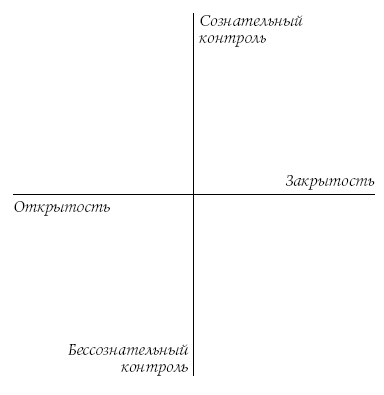 Но почему мы забыли о влиянии сознательного контроля? Неужели степень контроля собеседника не влияет на эффективность наших воздействий? Влияет, и даже очень. Но это отдельный параметр, который нельзя приравнивать к открытости. Можно сказать, что состояние человека раскладывается по двум осям координат. Первая – открытость/закрытость. Вторая – ось контроля.
