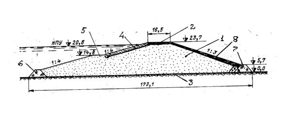 1 – тело земляной плотины из песка; 2 – гребень плотины – дорожное покрытие (гравий – асфальт); 3 – не фильтрующее основание плотины; 4 – крепление бетонными плитами против волнового воздействия на откос; 5 – берма на откосе упорная; 6 – банкет из каменной наброски для перекрытия русла р. Даугавы; 7 – дренажная призма для снижения выхода фильтрационный вод на низовой откос; 8 – крепление низового откоса посевом трав.