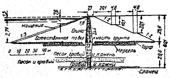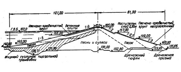 Рис.1.2.Поперечный разрез русловой намывной земляной плотины Рижской ГЭС [11].