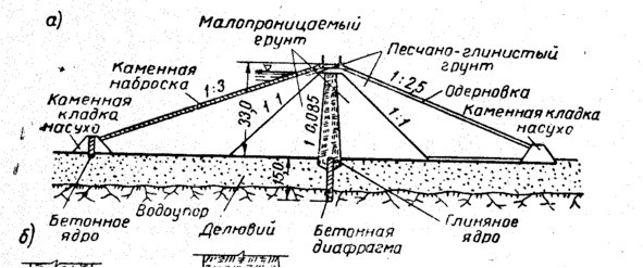 Если в основании плотины залегают хорошо фильтрующие пески, то для уменьшения фильтрации воды через основание и тело плотины, для повышения устойчивости плотины и сокращения потерь воды из водохранилища, применяют так называемые ядра и диафрагмы. Материалом ядра могут служить глина, суглинок, глинобетон, плотно трамбуемые или укатываемые слоями. (рис. 1.4, 1.5)