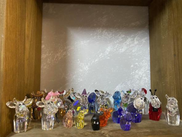 Это полка. И на ней стоят коровы Сваровски. Все коровы разные, цветные. Почему они разные? Потому что, во-первых, это — коллекция. Во-вторых, потому что с ними играет моя младшая дочь.