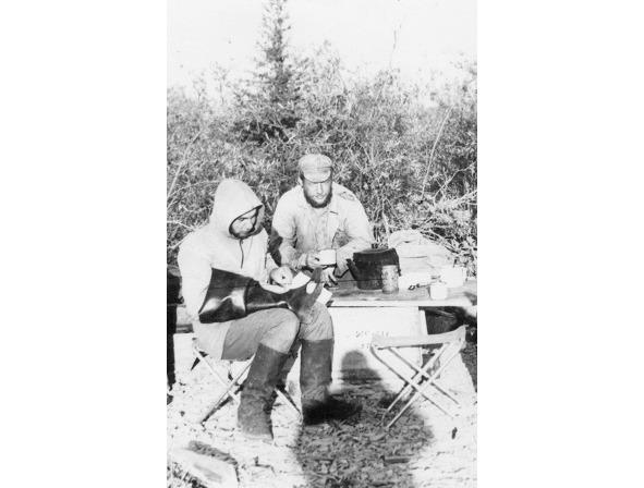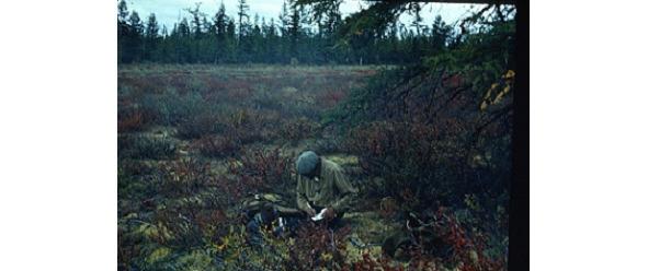 В это утро мы встали в пять часов и я с Анатолием Романовичем отправились на поиск реки. Речка Аверина течет где-то рядом и на ее берегах Ананьев надеялся найти какое-нибудь обнажение. Идем налегке. Я взял только фотоаппарат, он ружье. Спускаемся с крутояра и вместо реки попадаем на новое болото. Начинается новое блуждание. Ищем реку, а пока мокнем в ее заболоченной пойме. После трех часов поиска, так и не найдя реки, возвращаемся к месту стоянки.