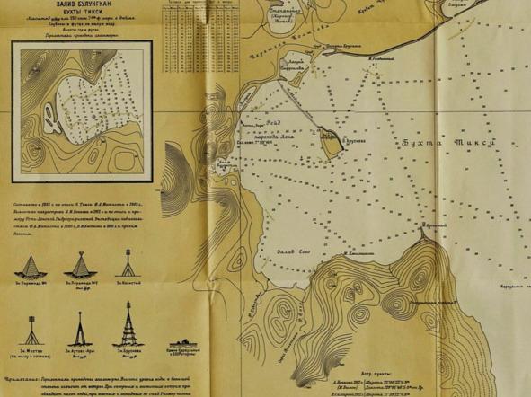 Проложив на карте крупного масштаба упомянутый азимут (67°,5) от маяка Прончищевой и отложив по нему расстояние с учетом погрешностей, получим контуры наиболее вероятного участка моря, на дне которого на глубине 22—30 метров покоится дубель-шлюпка «Якуцк».