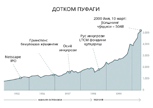 Интернет буларнинг барчасини ўзгартириб юборди. 1993 йил ноябрда расман “Mosaic” браузери оммага тақдим этилди ва у оддий одамлар учун интернетга уланиш имконини берди. “Mosaic” “Netscape”га айланиб, 1994 йил охирида ўзининг “Navigator” браузерини тақдим этди. “Navigator” жуда тез оммалашди – 1995 йил январь ойида браузер бозорининг тахминан 20 фоизини эгаллаган бўлса, 12 ой ичида деярли 80 фоизга чиқди – “Netscape” ҳали фойда келтирмаётган бўлса-да, 1995 йил август ойида IPOга (Initial public offering – фонд биржасида акцияларнинг биринчи марта оммага таклиф қилиниши) киришга муваффақ бўлди. Беш ой ичида, “Netscape” акцияларининг ҳар бири 28 доллардан 174 долларга кўтарилиб кетди. Бошқа технологик компаниялар ҳам гуркираб борарди. 1996 йилнинг апрелида “Yahoo!” оммавий савдода 848 миллион долларга баҳоланди. “Amazon”нинг қиймати эса 1997 йил май ойига келиб 438 миллион доллар эди. 1998 йилнинг баҳорига қадар ҳар бир компаниянинг акциялари тўрт баравар қимматлади. Скептиклар уларнинг кирим ва даромадлари интернетга алоқадор бўлмаган компанияларникига нисбатан бир неча баравар юқорилигига шубҳа қилди. Бозорни ақлдан озган деб хулоса қилиш ҳеч гап эмасди.