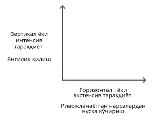 Келажак ҳақида ўйларканмиз, унинг бугундан кўра тараққий этганроқ бўлишига умид қиламиз. Бу тараққиёт қуйидаги икки шаклдан бирида юз бериши мумкин. Горизонтал ёки экстенсив тараққиёт – иш берадиган нарсалардан нусха кўчириш, яъни 1 дан n га силжиш. Горизонтал тараққиётни тасаввур қилиш осон, чунки у бизга яхши таниш. Вертикал ёки интенсив тараққиёт эса янги нарса яратишни, яъни 0 дан 1 га ҳаракатланишни англатади. Вертикал тараққиётни тасаввур қилиш қийинроқ, чунки у ҳали ҳеч ким қўл урмаган ишларни талаб қилади. Дейлик, битта ёзув машинасидан нусха олиб, 100 та машина яратсангиз, сиз горизонтал тараққий этган бўласиз. Агар ёзув машинаси бўлса-ю, сиз матн процессорини яратсангиз, унда вертикал тараққиётга эришган бўласиз.