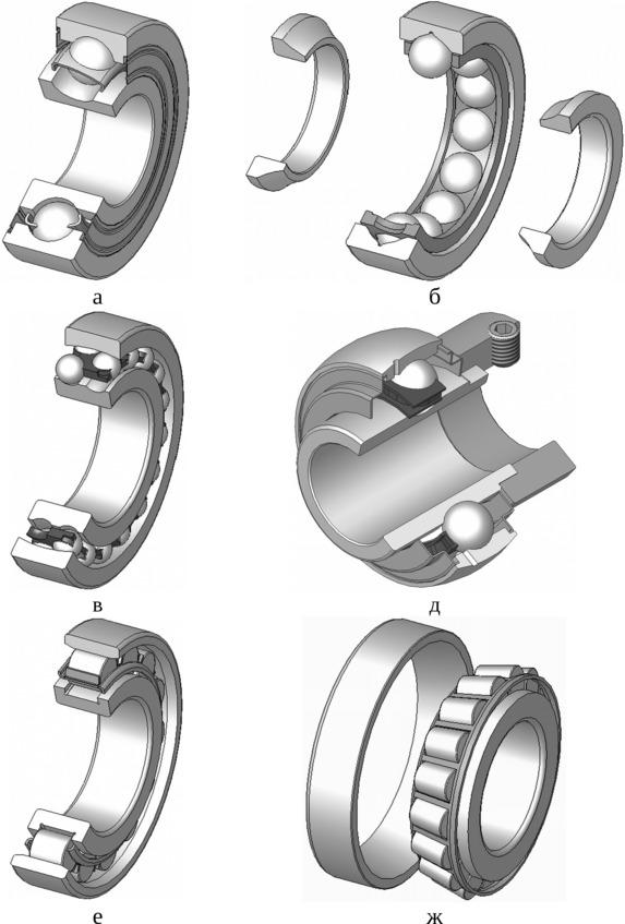 Конструкция подшипников качения состоит из двух колец, тел качения (шариков или роликов) и сепаратора (некоторые типы подшипников могут быть без сепаратора), отделяющего тела качения друг от друга, удерживающего на равном расстоянии и направляющего их движение (рис. 1.1). По наружной поверхности внутреннего кольца и внутренней поверхности внешнего кольца (на торцевых поверхностях колец упорных подшипников качения) выполнены желоба — дорожки качения, по которым при работе подшипника катятся тела качения.