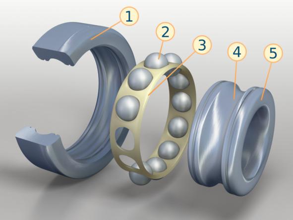 Рис. 1.1. Устройство радиального шарикоподшипника: 1 — внешнее кольцо; 2 — шарик (тело качения); 3 — сепаратор; 4 — дорожка качения; 5 — внутреннее кольцо