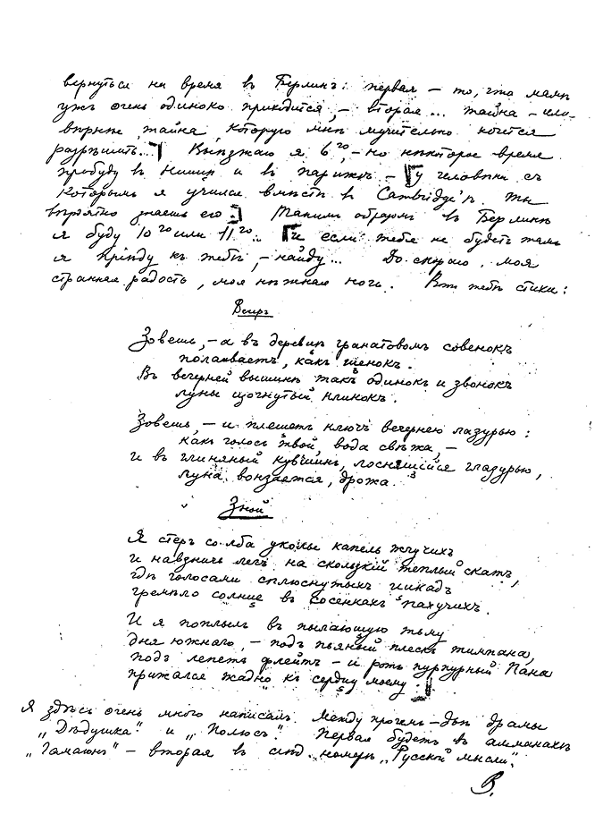 Любовь моя, я возвращаюсь в среду, 23-го сего месяца. Это уже окончательно. В «Руле» уже появилось мое объявленье. Фамилия моя напечатана так жирно, что я подумал было: извещенье о смерти. Если и тебе попадется на глаза комната с пансионом не дороже «доллáра» в день (а желательно: 3 марки), то сообщи этому самому господину Н. Я, знаешь, так привык к своему псевдониму, что странно видеть истинное мое названье.