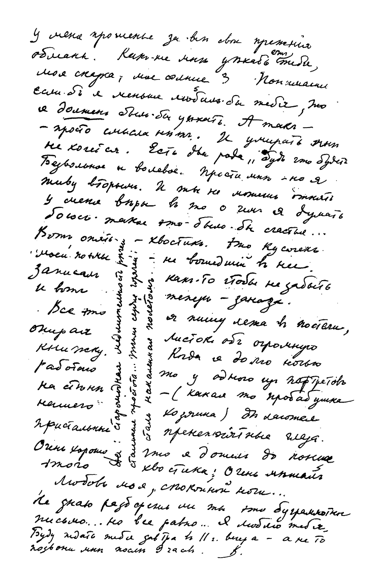 До скорого, моя любовь, не сердись на меня. Я знаю, что я очень скучный и неприятный человек, утонувший в литературе… Но я люблю тебя.