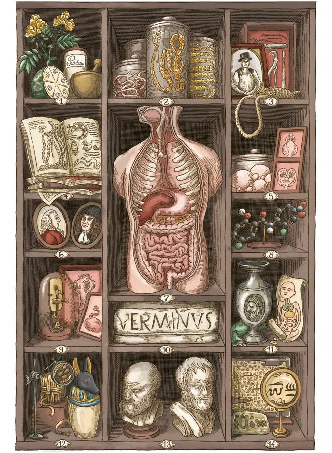 Ячейка 1: цветы и плоды колоцинта (Citrullus colocynthis), применявшиеся в давние времена в качестве слабительного, предназначенного для моего изгнания. Сосуд с экстрактом граната (Punica granatum), использовавшимся из-за его противоглистных свойств. Ячейка 2: зловещие образцы трупов моих собратьев цепней и других кишечных червей, помещенные в банки. Ячейка 3: Готтлиб Фридрих Генрих Кюхенмейстер и его инструменты для вскрытия висельников с целью моего извлечения из их пищеварительных трактов. Ячейка 4: причудливые зарисовки червей и паразитов, сделанные Николя Андри де Буарегаром. Ячейка 5: банка с гидатидными кистами, а также изображения инвагинированных и развернутых милашек — личинок-цистицерков. Ячейка 6: портреты двух моих биографов: Николя Андри де Буарегара и Эдварда Тайсона. Ячейка 7 (в центре): анатомическая модель человека, демонстрирующая, кроме прочего, мое жилье — пищеварительную систему. Ячейка 8: модель молекулы никлозамида, (пагубного) противоглистного средства, часто используемого для геноцида представителей моего вида. Ячейка 9: микроскоп Антони ван Левенгука — инструмент, позволивший обнаружить мою «головку», сколекс, видный на изображениях взрослого червя и личинки на стадии цистицерка (на заднем плане). Ячейка 10: стела, посвященная Верминусу, малому римскому божеству, которому молились во время эпидемий ленточного червя у крупного рогатого скота. Мой вклад в вашу мифологию. Ячейка 11: профиль моего биографа Авиценны на древней вазе. Именно Авиценна подробно изучил и описал вашу систему кровообращения и пищеварения. Мешочек с семенами тыквы иллюстрирует аналогию, которую он проводил между моими члениками и этими семенами из-за их формы. Кое-где в то время меня называли cucurbitini. Ячейка 12: первые следы нашего длительного взаимодействия — мумифицированные органы пищеварения, содержащие несколько яиц представителя моего вида. Эти органы часто находили в египетских сосудах-канопах с крышкой в форме головы Анубиса, в которых обычно хранили желудки умерших. Ячейка 13: два древних биографа — Гиппократ (слева) и Аристотель (справа). Ячейка 14: первое письменное упоминание о моих подвигах — кусок камня с иероглифом «кишечный червь» и папирус Эберса, на котором можно прочитать мое имя, «червь цепень».