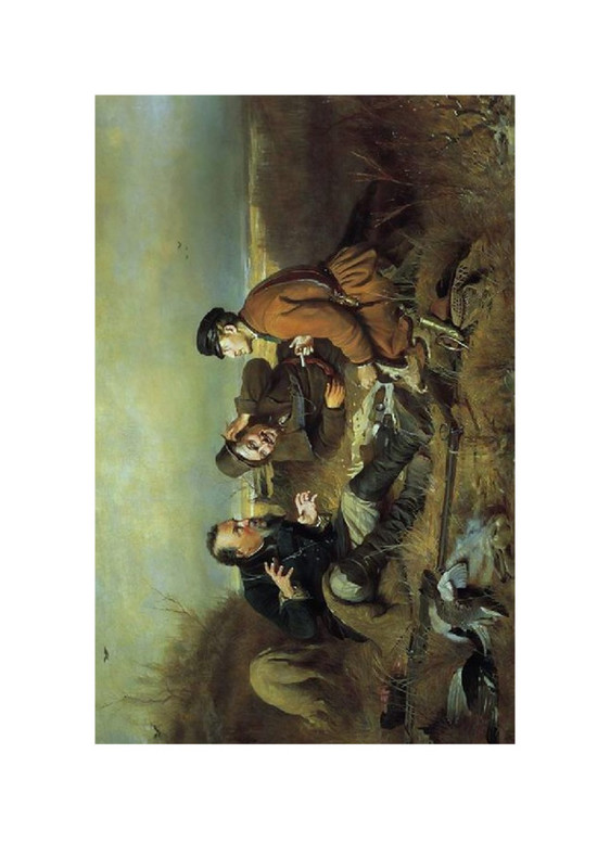 «Туточки!» — егерь что-то разглядывал, наклонившись к земле. Это оказалась мёрзлая, трудноотличимая от земли картофельная поедь [№1]. Егерь подпустил к ней собаку: рослого арлекина Гермеса, взятого за отдельную плату в деревне. Кобель сунулся мордой в землю, потоптался, обнюхивая, и — видно, и впрямь неплохой выжлец [№1] попался, — повёл.