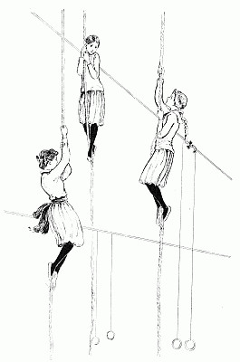 No. 18 in the second corridor was a good-sized room, with two windows, one of them crossed on the outside by a fire-escape. Its present aspect was bare and unhomelike. The furniture consisted of an iron bedstead, a bureau and wash-stand, two chairs and a small table, all neat, but severely plain. The small square of carpet on the floor was a cold gray mixture with brown flowers on it. As Peggy Montfort looked about her, her heart sank. Was she to live here, to spend her days and nights here, for a whole endless year? She thought of her room at home, the great sunny room that she shared with her sister Jean. That had four windows, which were generally flung wide open; it was bare, because she and Jean liked to have plenty of space for gymnastics and wrestling; but that was a homelike, accustomed bareness, and they loved it. The great old four-post bed, with the round balls on which they loved to stand and perform circus tricks; the hammock slung across one end; the birds' nests and hawks' wings that adorned the walls in lieu of pictures; the antlers on which they hung their hats,—all these, or the thought of them, smote Peggy's stout heart, and sent it lower and lower down.