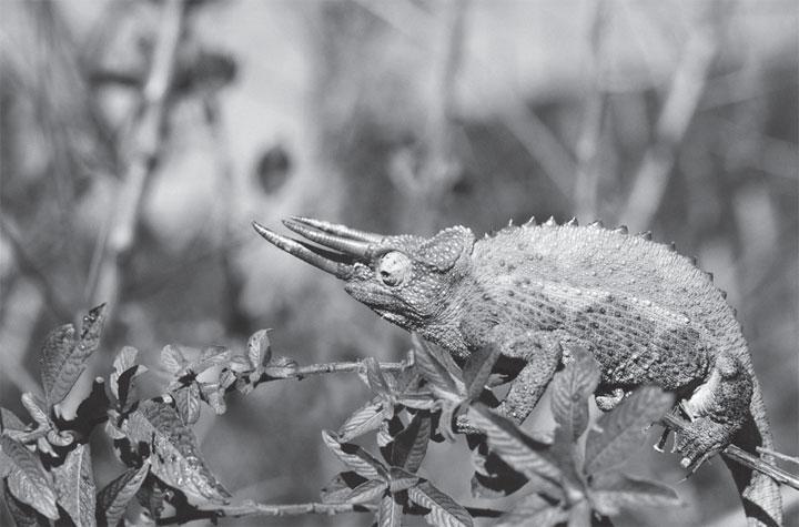 Хамелеона очень трудно увидеть. Его кожа принимает цвет предмета, на котором он сидит. В зеленой листве он становится зеленым, передвинется на темную кору – и сразу темнеет. Такая способность хамелеона менять окраску служит ему хорошей защитой от врагов – хищных зверей и птиц. Когда кто-то из них все-таки его обнаружит, хамелеон пытается напугать врага: надувается, как шар, шипит и фыркает.