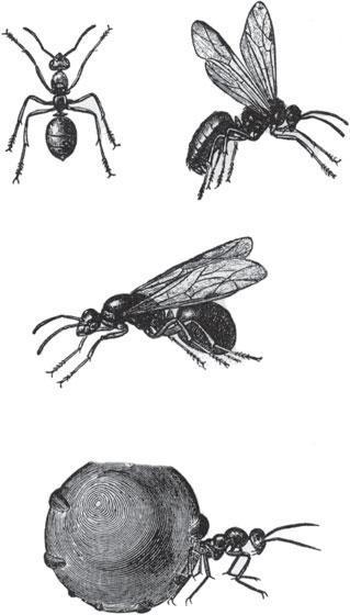 Известно, что главные муравьиные самки и самцы – крылатые, а все остальные муравьи – бескрылые. В брачный период самки и самцы покидают колонии и поднимаются высоко в небо. После спаривания самцы сразу же погибают, а самки возвращаются на землю и основывают новую колонию. Сначала самка зарывается в землю, устраивает там гнездо и откладывает в нем яйца. Когда из яиц вылупливаются безногие личинки, каждой из них матка помогает свить кокон, и как только внутри него подрастет муравейчик, она разрывает кокон с одного конца и вытаскивает детеныша наружу. Так рождаются рабочие муравьи, которые сразу же начинают работать и заботиться о своей матке – королеве.